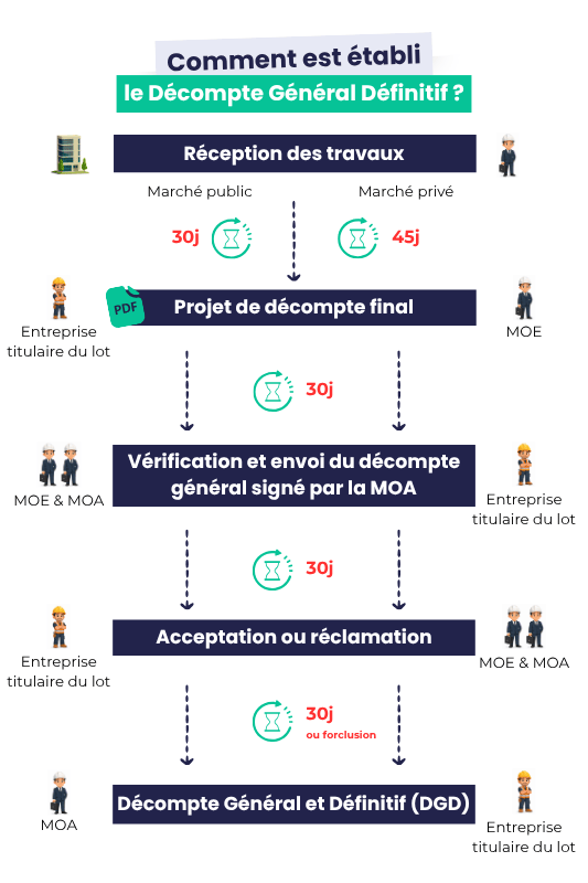 | Décompte Général et Définitif (DGD) | L’entreprise de travaux | La signature de l’entrepreneur confère au document la qualité de DGD. | 30 jours pour accepter ou refuser. |